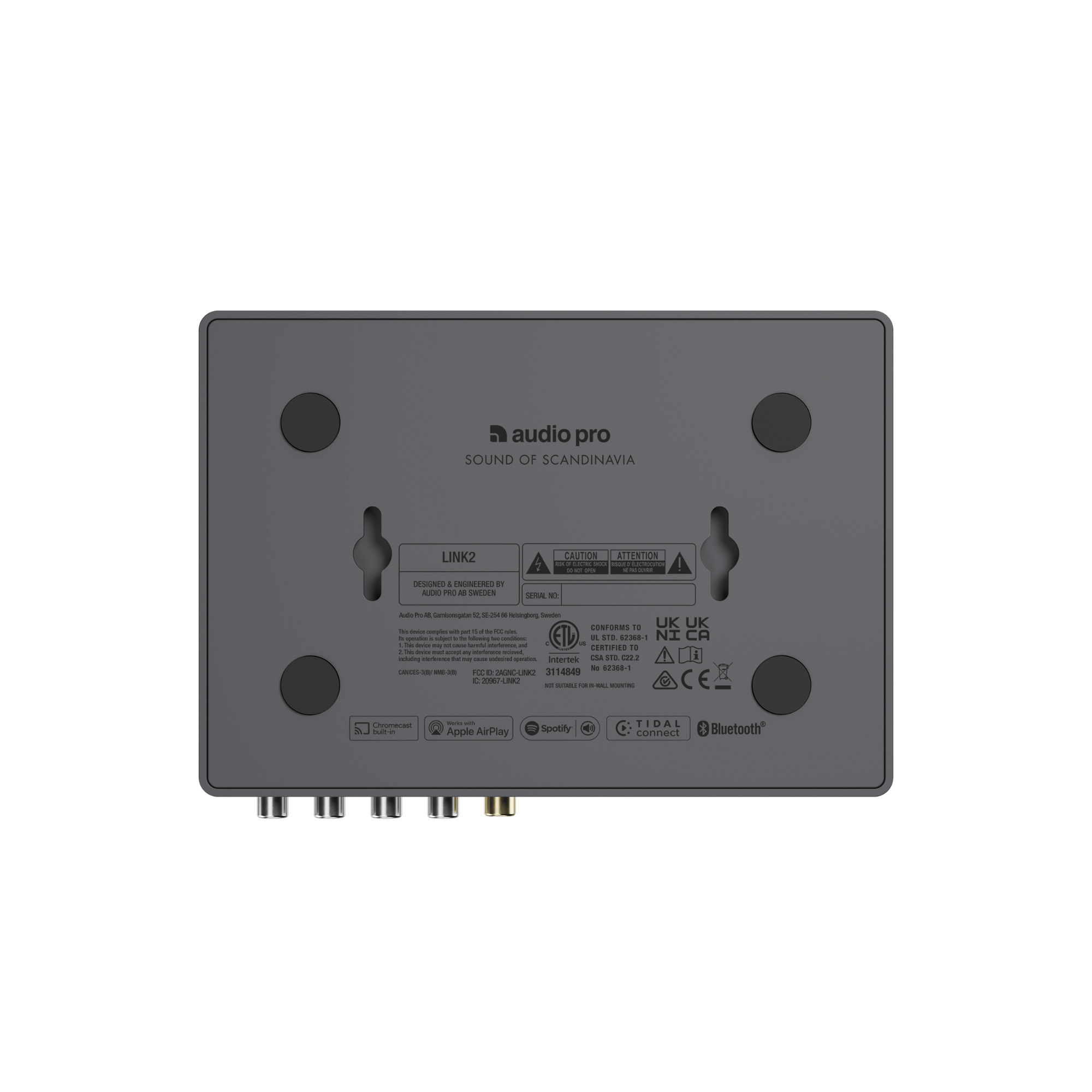 - AirPlay 2, Google Cast and Audio Pro Multiroom system.